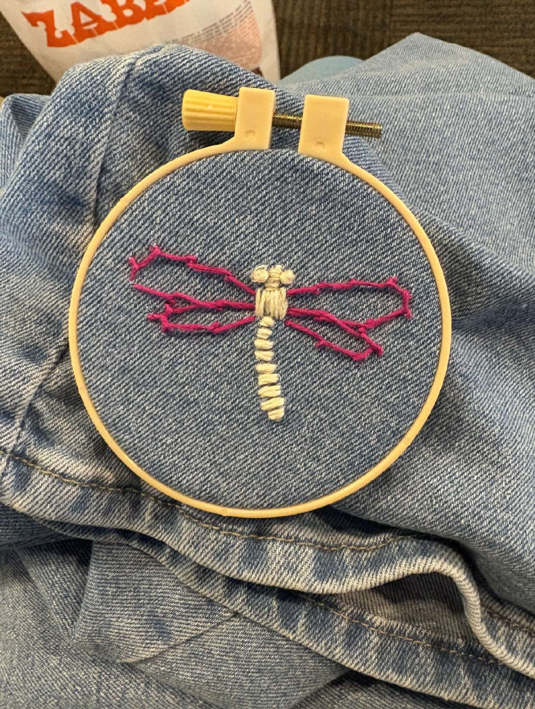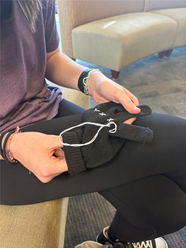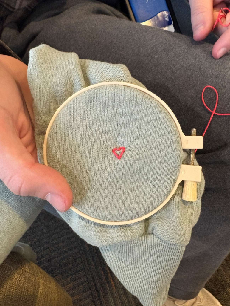 stitching us together, a project by Dylan Nissley. the positive outcomes of socialization, fine motor skill development by way of sewing, and clothes sustainability can be combined to multiply benefits. this can be visualized as a group of people embroidering/mending clothes and chatting together.